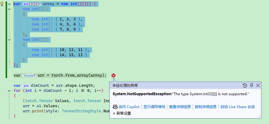 另外要注意,C# 有多维数组和交错数组,下面是交错数组的声明方式,TorchSharp 并不支持。多维数组是数组,交错数组是数组的数组,或数组的数组的数组,要注意区分。