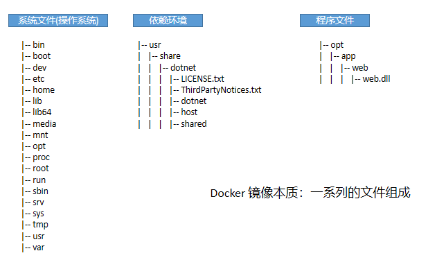 Docker 中,层层组成镜像的技术也是联合文件系统,Union File System。Docker 镜像中的操作系统是根文件系统,在上一小节的图片中,可以看到有 bin、boot 等目录。我们都知道,Docker 镜像是由多层文件组成的,在上面的示例图片中有三层组成:根文件系统、环境依赖包、应用程序文件。当镜像层生成后,便不能被修改,如果再进行操作,则会在原来的基础上生成新的镜像层,层层联合,最终生成镜像。当然生成的镜像可能会因为层数太多或者操作过多,导致出现大量冗余,镜像臃肿。