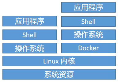 Docker 容器中包含了一个操作系统,包含简单的 shell 或者不包含,其层次结构如图所示: