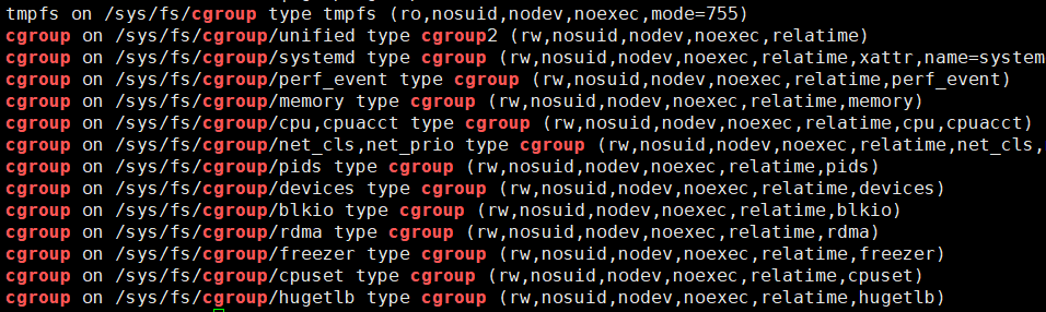 cgroups 可以控制多种资源,在 cgroups 中每种资源限制功能对应一个子系统,可以使用命令查看: