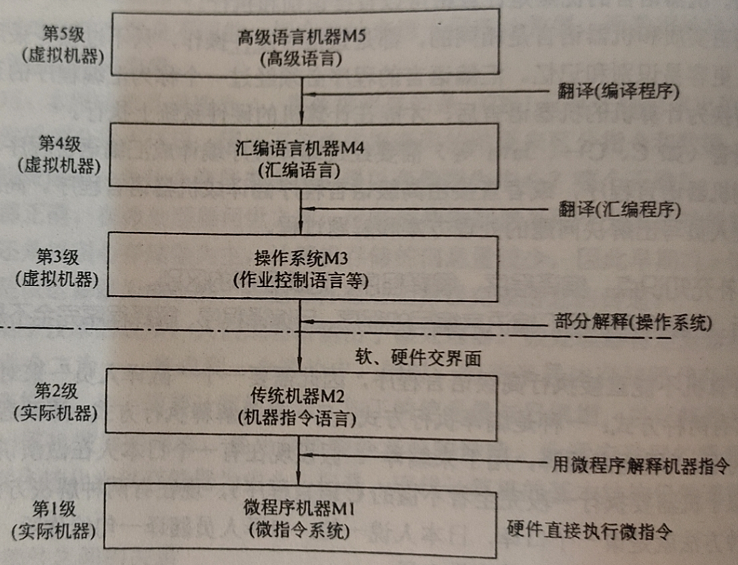 从语言角度,一台由软硬件组成的通用计算机系统可以看作是按功能划分的多层机器级组成的层次结构。