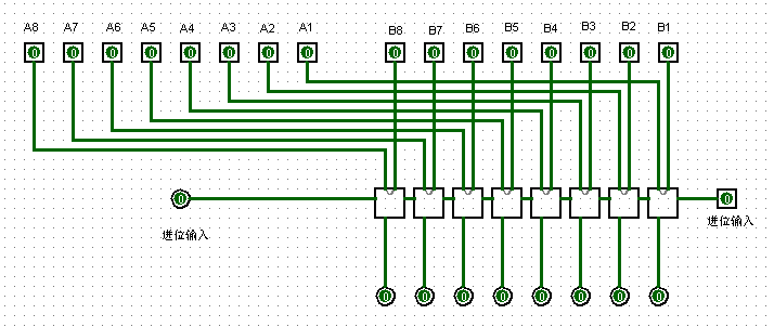 微程序是使用微指令编写的,一个微程序即一个机器指令,一般直接由硬件执行,它可以表示一个最简单的操作。例如一个加法指令,由多个逻辑元件构成一个加法器,其元件组成如下图所示(图中为一个 8 位全加器)。