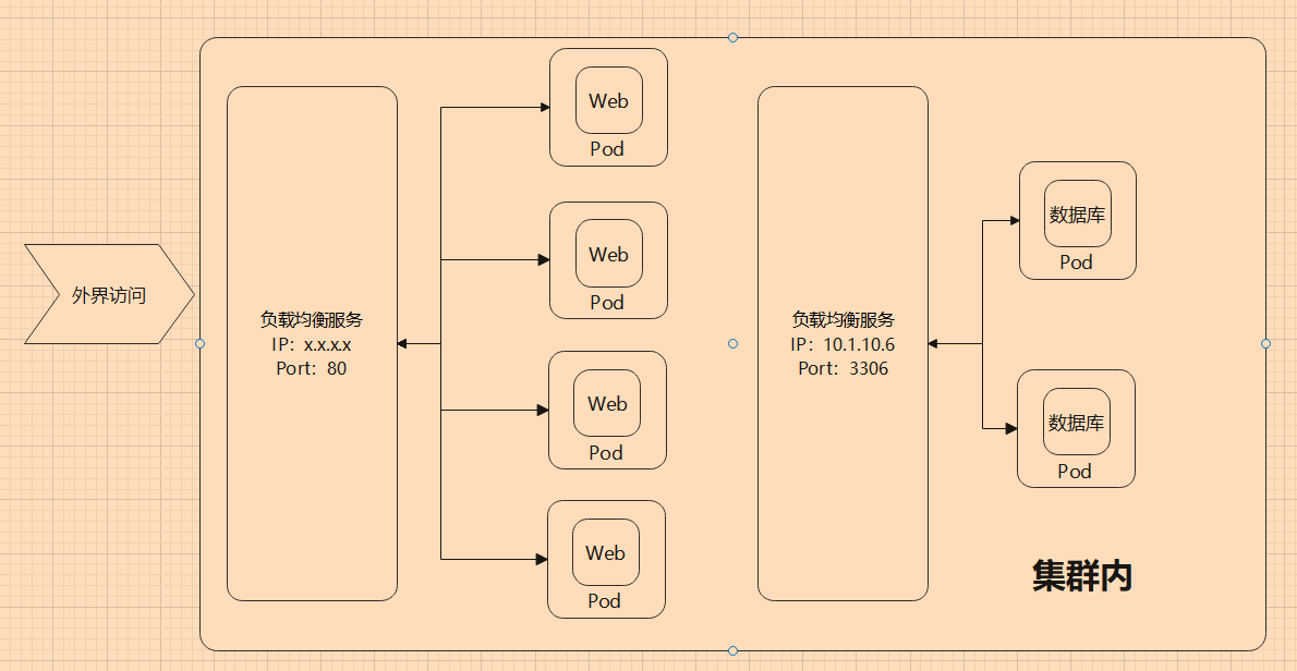 如果是一个较大的网站,网站使用了多个微服务,则前端更可能放到一个 Pod 中,用户访问前端页面,然后前端根据访问的模块,自动访问不同的服务。