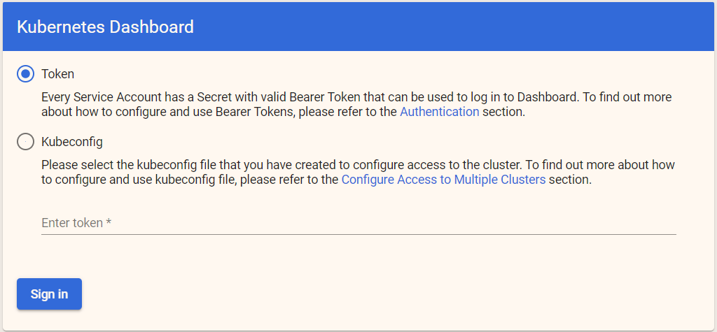 可以看到,访问方式有 Token 和配置文件方式(kubeconfing),这两者后面再讲。