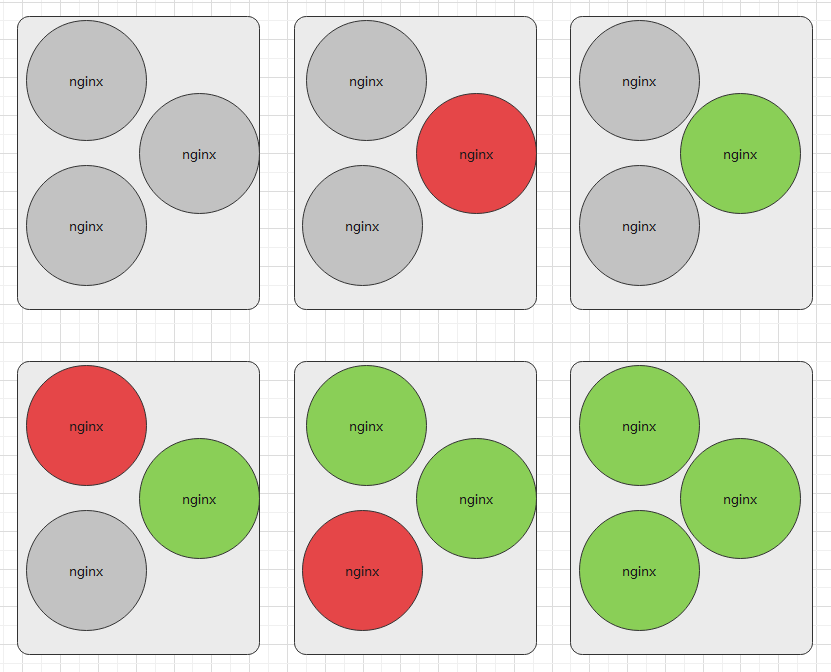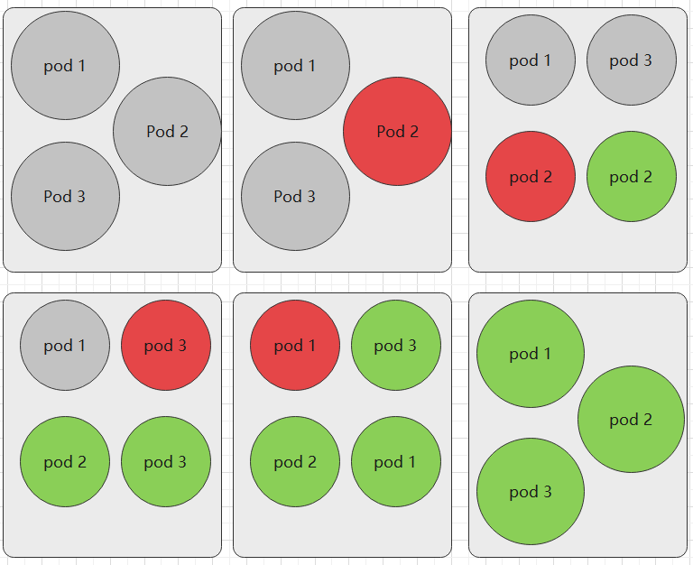 我们在创建 Deployment 时,生成了三个 Pod ,而当我们触发镜像版本更新时,Pod 不会一次性更新,而是按照一定规则每次只重新部署一部分 Pod,Pod 更新替换过程类似下图所示(实际上 Pod 数量可能大于 3个):