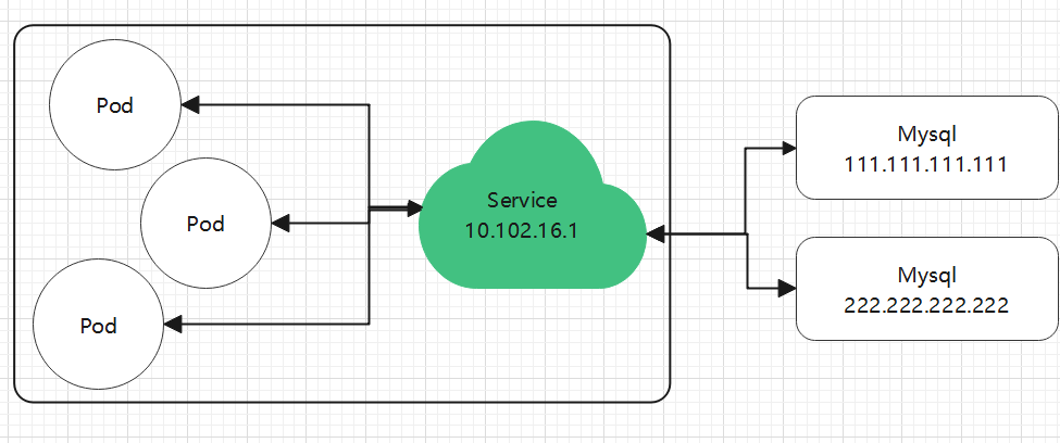 但是,Mysql 服务在云服务器上,不在自己的 Kubernetes 集群上,我们想在集群中创建一个 Service 来对这两个 IP 进行负载均衡,那么,我们怎么在 A 应用中访问 Mysql?写死 IP?但是现在有两个 Mysql IP,代码里面只能写一个呀,这样怎么做负载均衡?