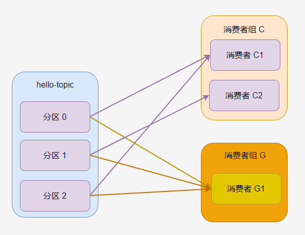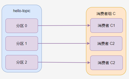 如果主题有多个分区,那么分区会被一定规则分配给消费者组的消费者,例如下图中,消费者 C1 被分配到 分区 0 和分区 2,消费者 C2 分到 分区 1。