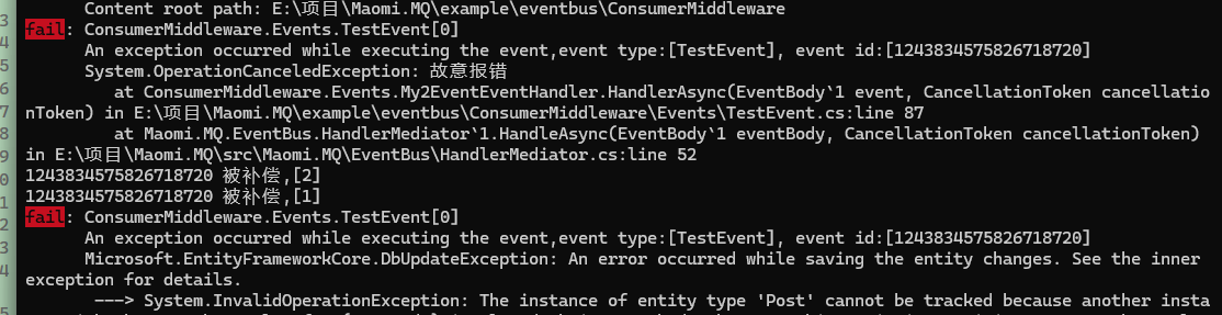 事件执行时,如果出现异常,也是会被重试的,中间件 TestEventMiddleware 的 FaildAsync、FallbackAsync 会被依次执行。