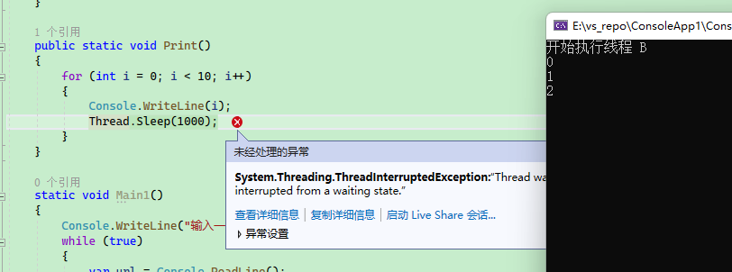 可见,当对另一个线程调用 Interrupt 时,会弹出 System.Threading.ThreadInterruptedException 异常,导致线程中止。在调试环境下,可能会导致 Vistual Studio 弹出异常,直接启动编译后的程序,则不会弹出异常。