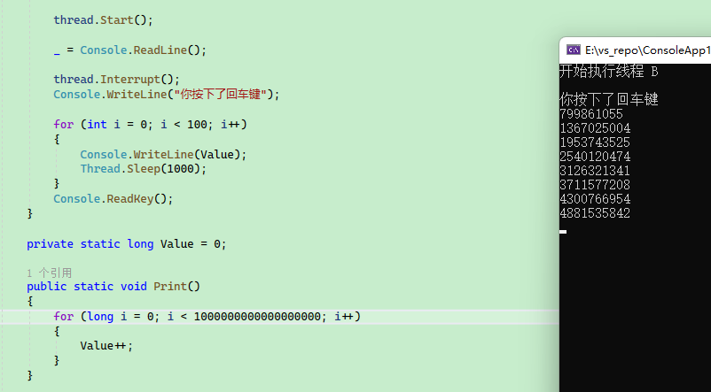 如果你细心留意,会发现第二个 Print() 例子中的 Thread.Sleep() Console.WriteLine(); 都被去掉了,因为除了 Thread,Sleep() 会导致 WaitSleepJoinConsole.WriteLine(); 与控制台进行 IO 传输时,也会发生中断当进程/线程需要执行 IO 操作时,都会发生中断,进程/线程被暂停,等待 IO 结果,期间 CPU 会执行其他线程,中断与软硬件有关,读者可以参考计算机组成原理或操作系统方面的书籍,这里就不在细谈。